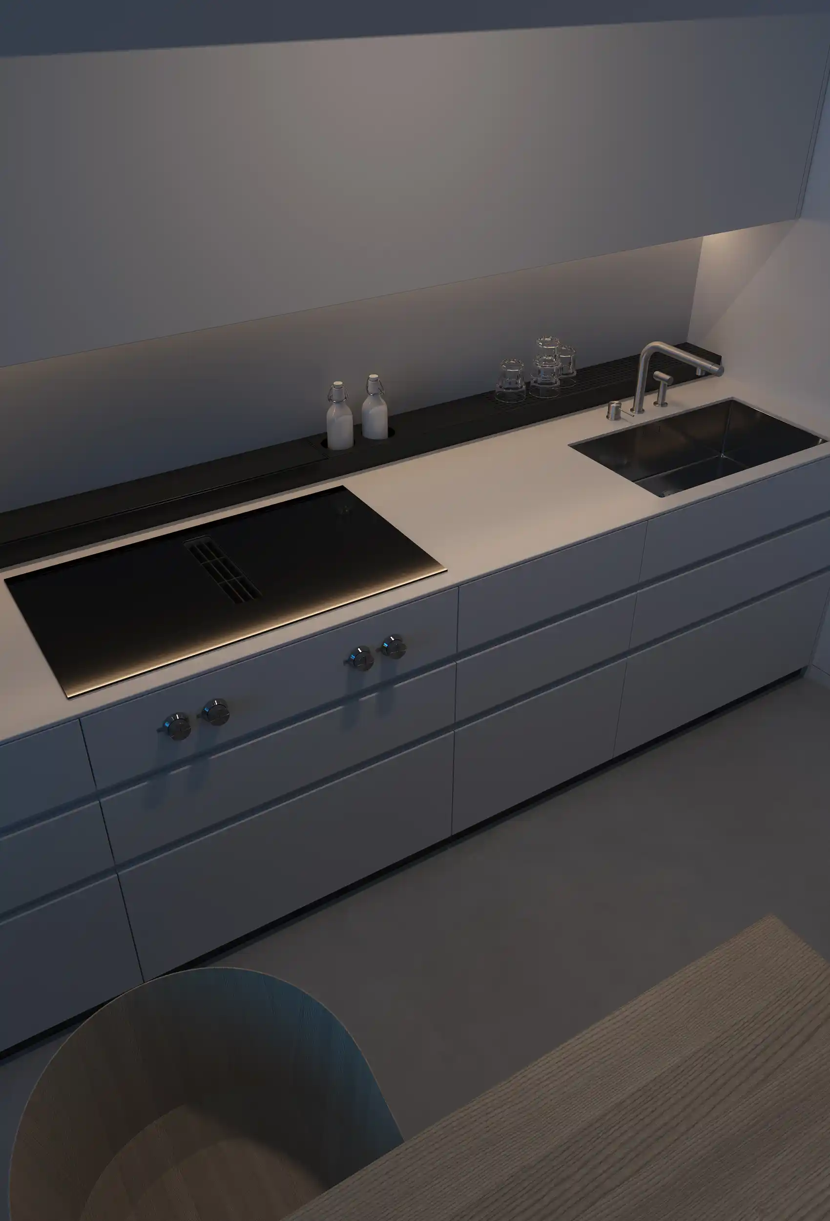 This kitchen is made in a minimalist style. A long worktop with a built-in sink and cooking surface creates a functional space for cooking. The color palette consists of neutral tones: the cabinets and drawers are white, and the tabletop is black, which creates a contrast.