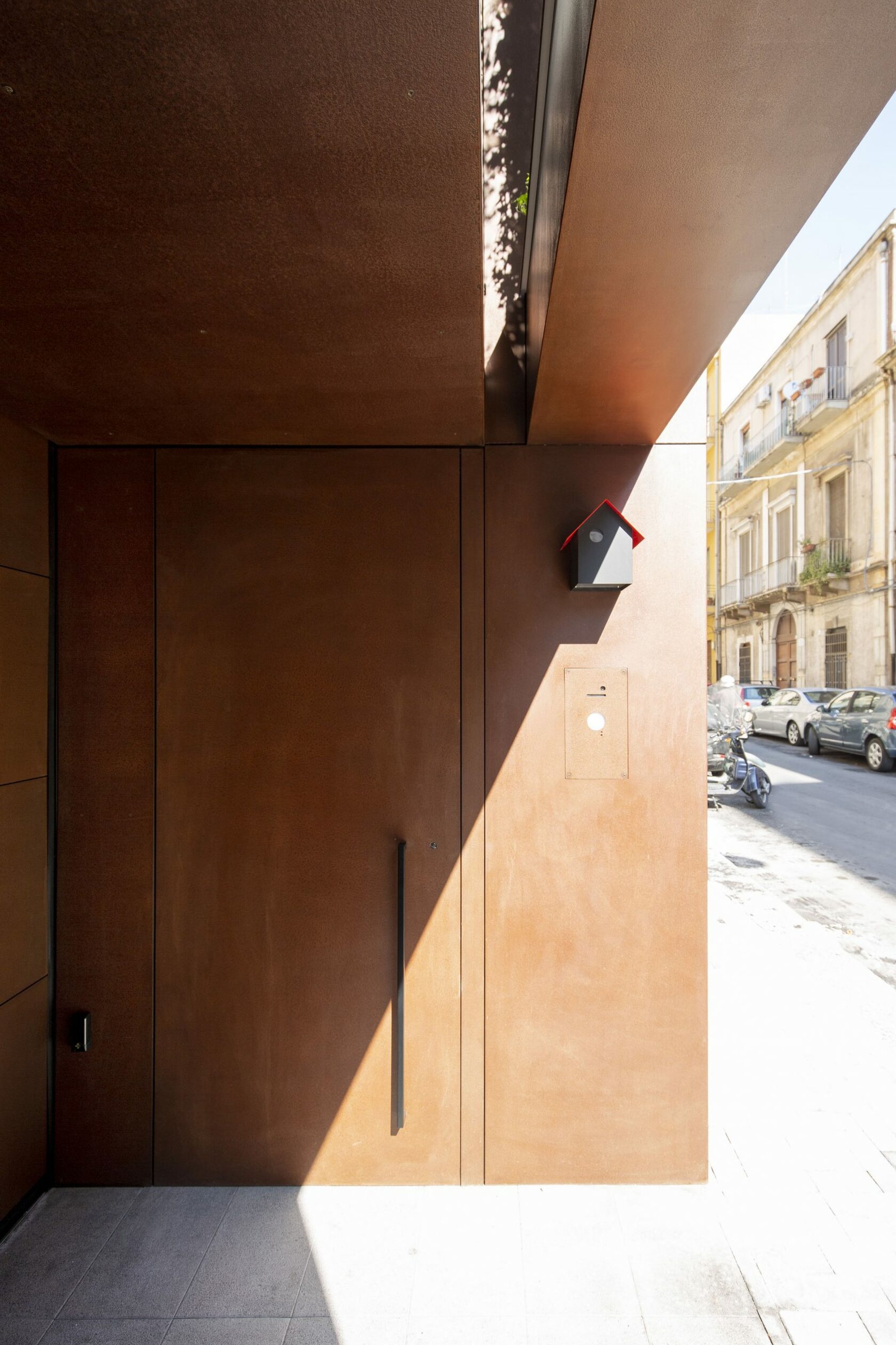 This modern house seamlessly integrates with its forested surroundings while maintaining a distinct contemporary aesthetic. The structure features a mix of warm wood tones and cool gray metal, creating visual interest through contrasting materials and colors. A simple concrete path leads to the entrance, emphasizing the clean lines of the overall design. Large windows allow ample natural light and provide views of the surrounding greenery, blurring the line between indoor and outdoor spaces.