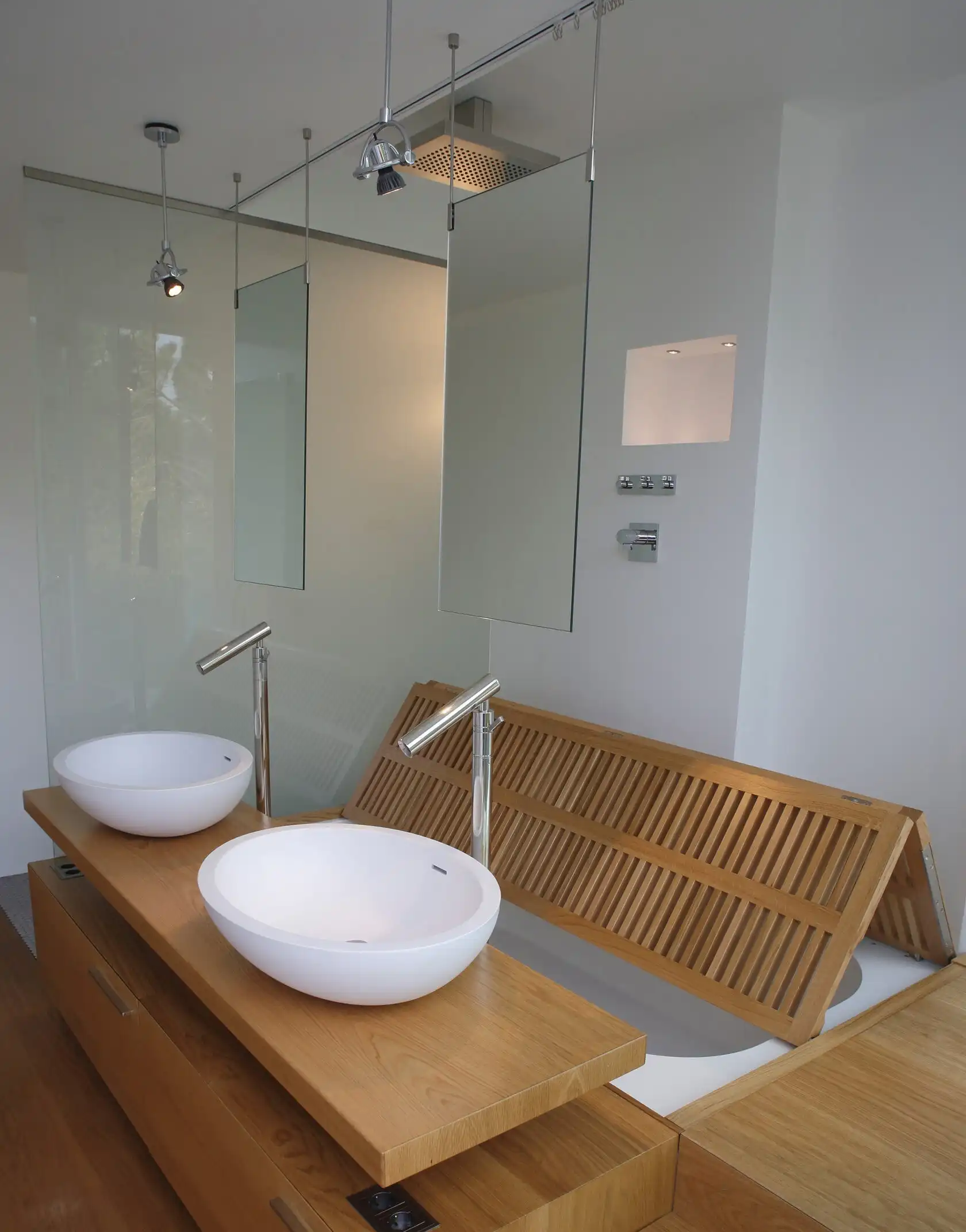 This contemporary residence in Mynystercki combines modern design with a touch of nature. The sleek exterior is characterized by sharp angles and large glass panels, which blur the line between indoor and outdoor spaces. Inside, the open-plan layout features minimalist decor with high-end finishes, creating a luxurious yet comfortable living environment. The use of natural materials such as wood and stone adds warmth and texture, making the home a perfect urban sanctuary.