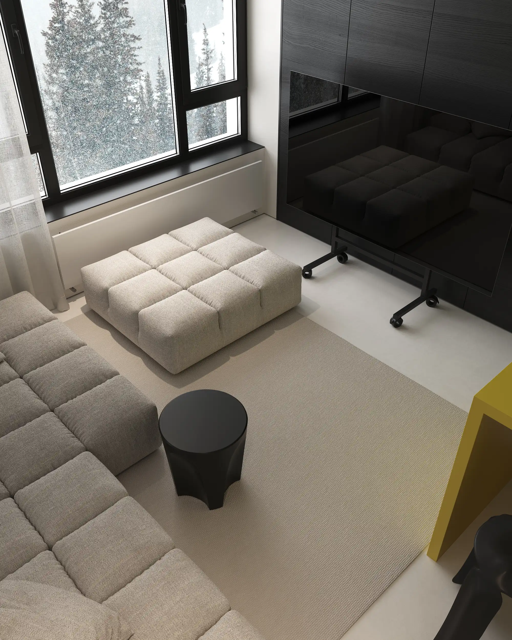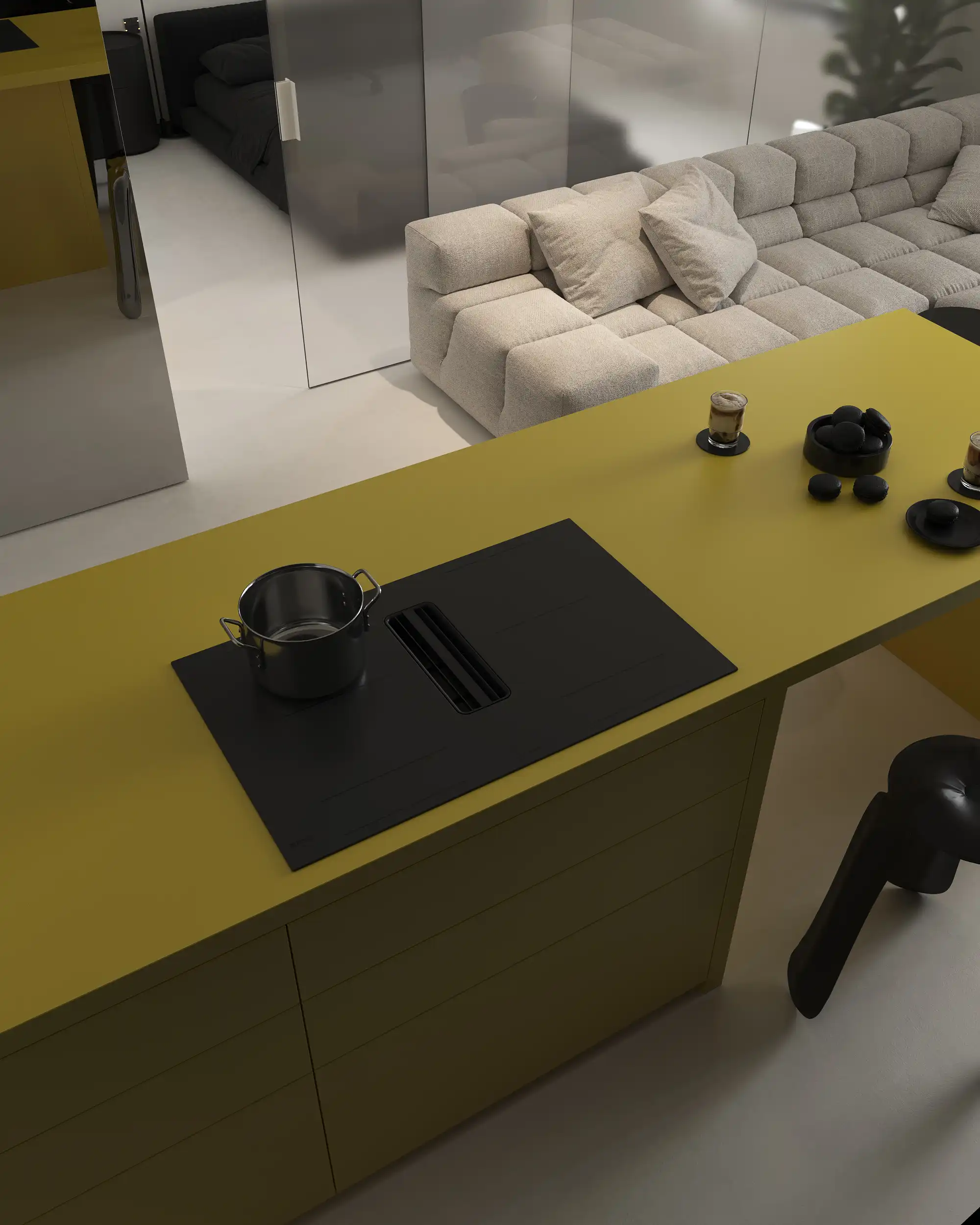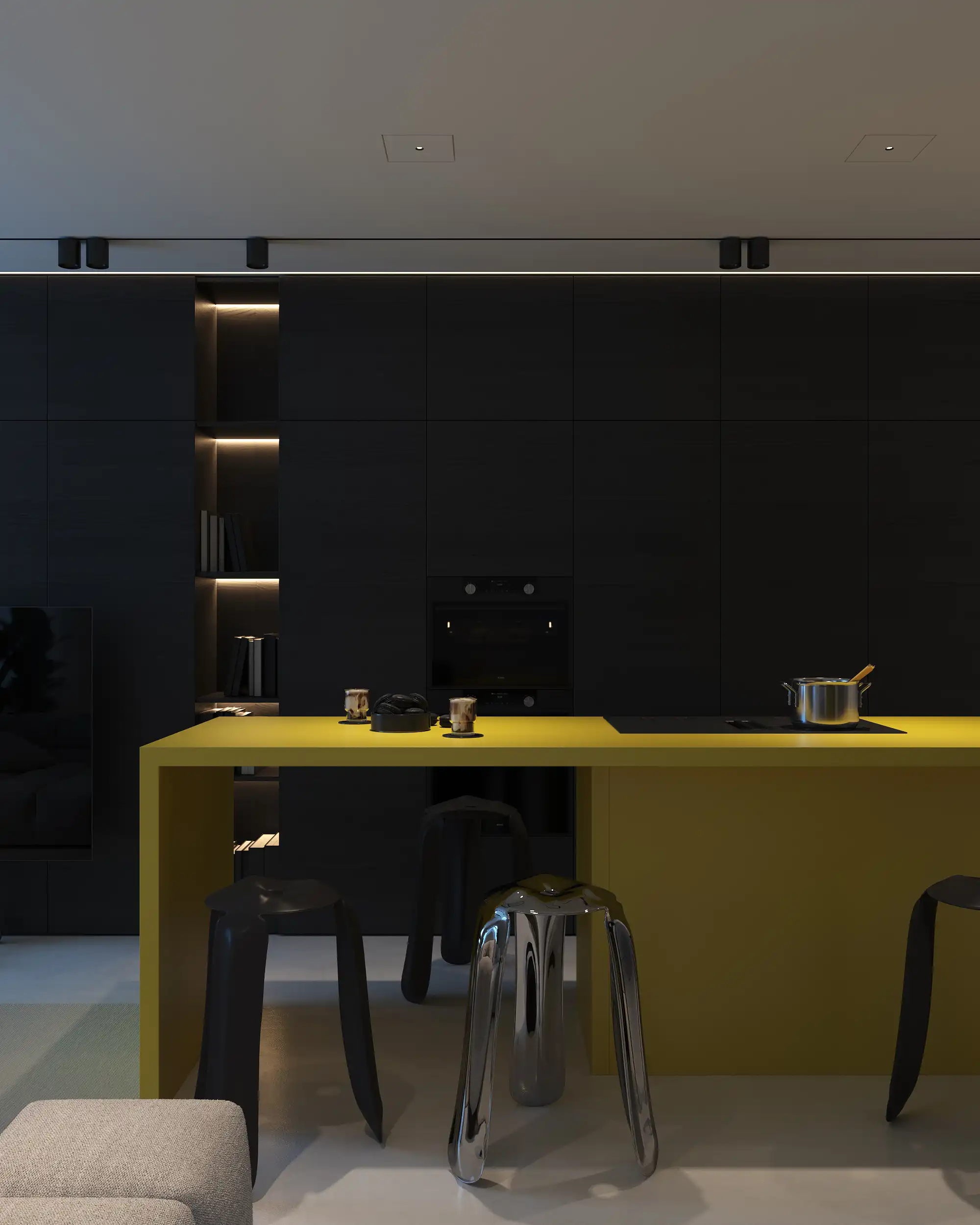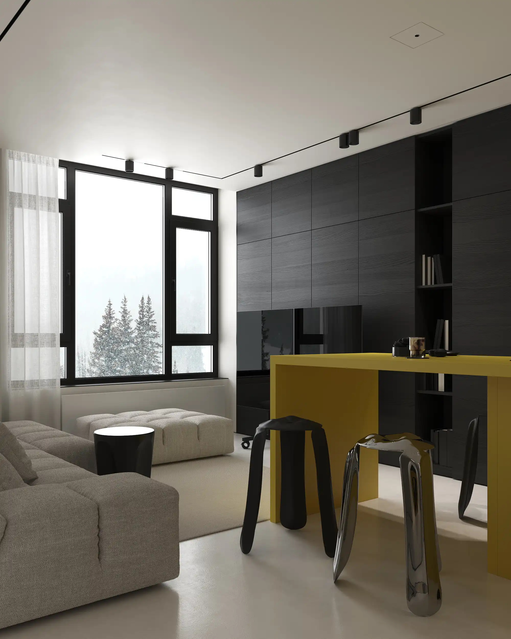 In the center of the room there is a yellow kitchen island, which looks like an expressive accent among the monochrome background. It is not only functional, but also adds welcome and sophistication. Clean lines and a minimalist approach to the design of walls and furniture create an impression of space and lightness. Natural light entering through the large window, makes the room brighter and cozier. All details are thought out to the smallest detail to ensure convenience and practicality.