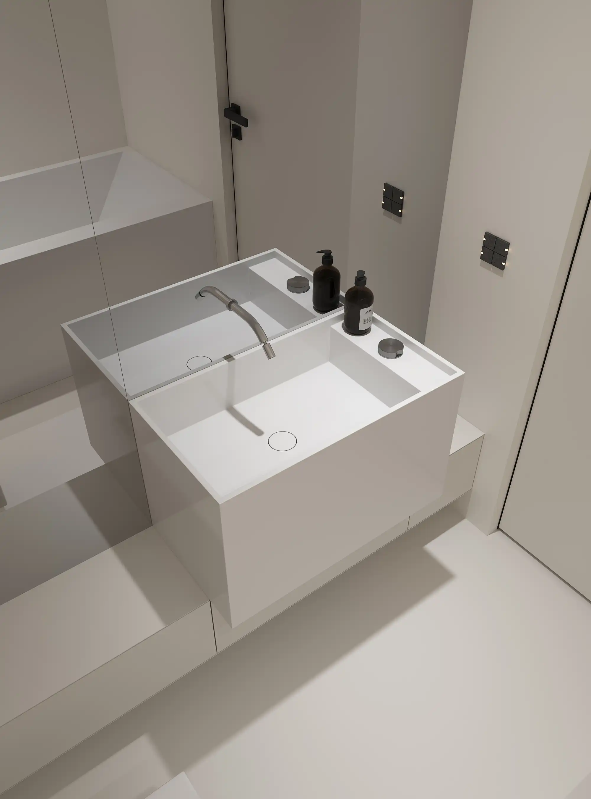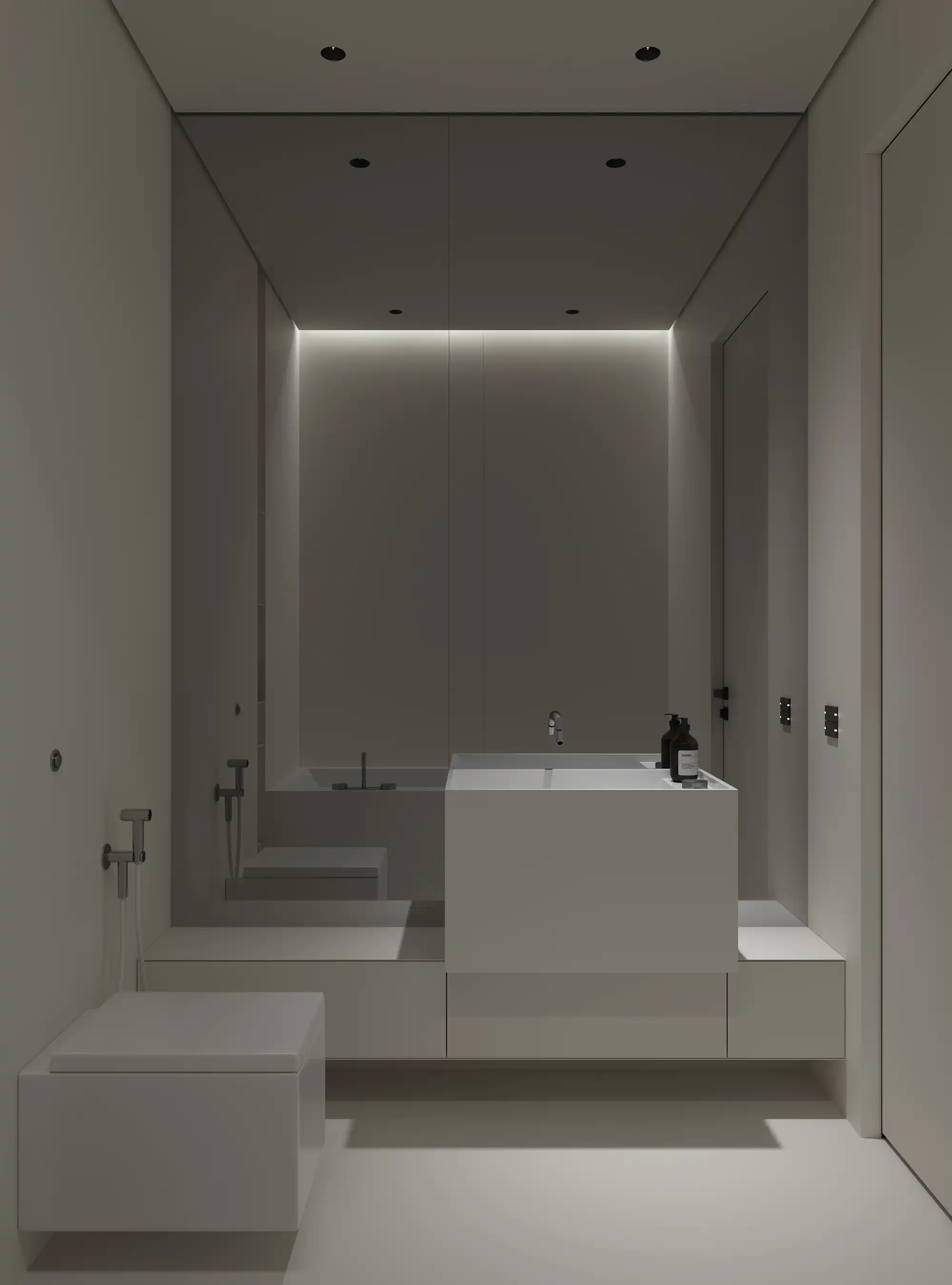 The design of the bathroom is made in a modern minimalist style, which emphasizes elegance and functionality. The main element of the room is a rectangular bath, built into a raised platform, which creates an integrated look with the surrounding floor.
