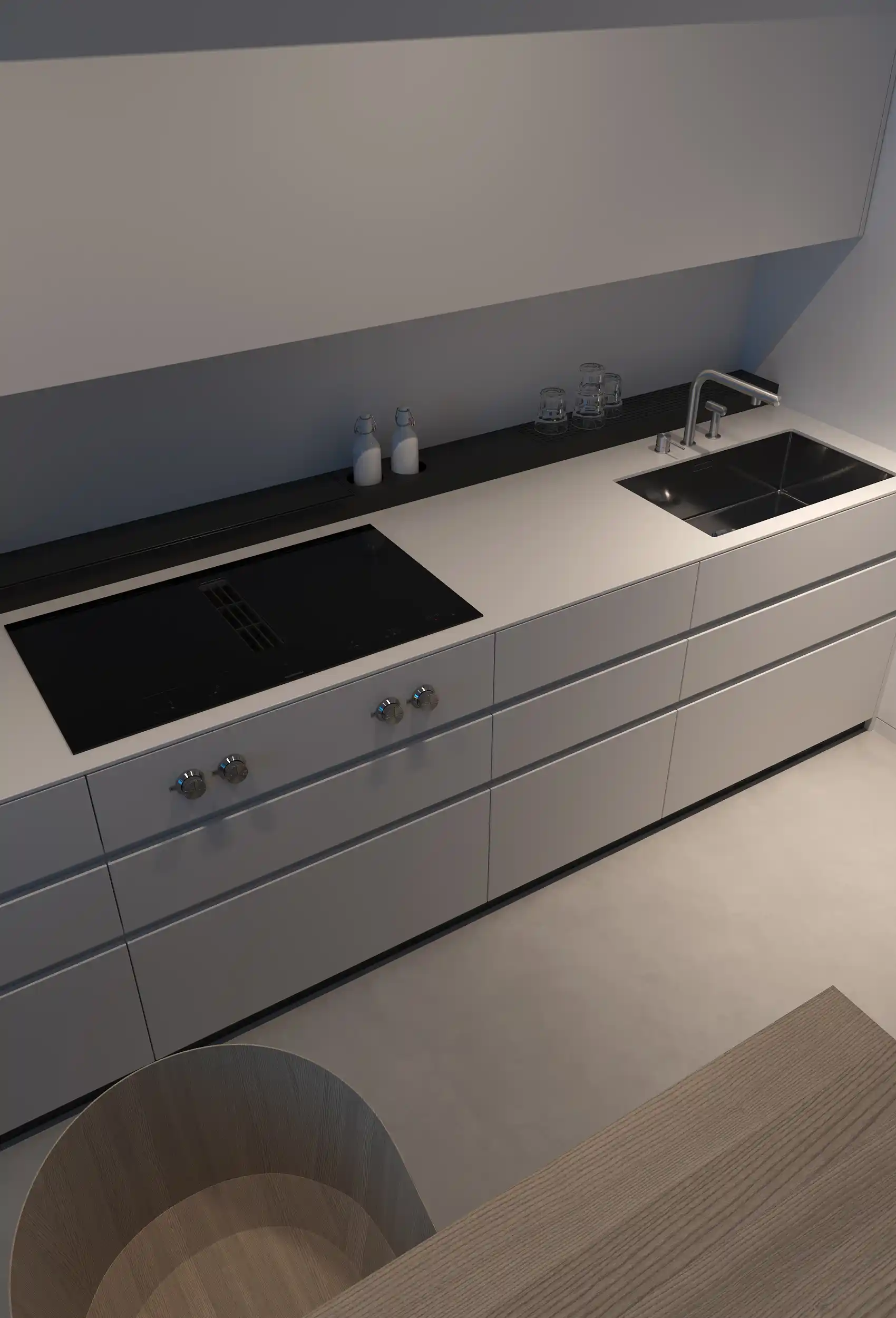 This kitchen is made in a minimalist style. A long worktop with a built-in sink and cooking surface creates a functional space for cooking. The color palette consists of neutral tones: the cabinets and drawers are white, and the tabletop is black, which creates a contrast.
