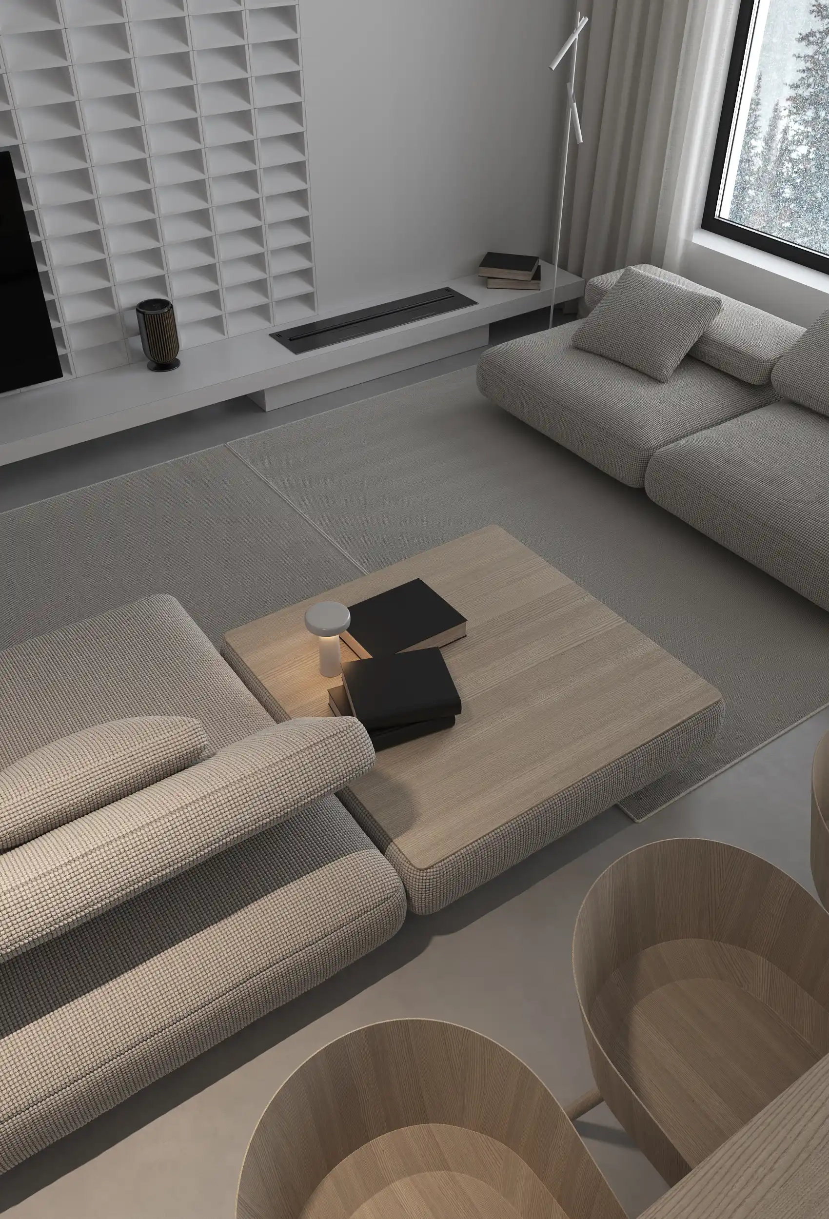 This living room is made in a minimalist style with a neutral color palette, mainly shades of gray and white. A large window opens a view of a calm natural landscape, which creates a feeling of coziness and harmony.