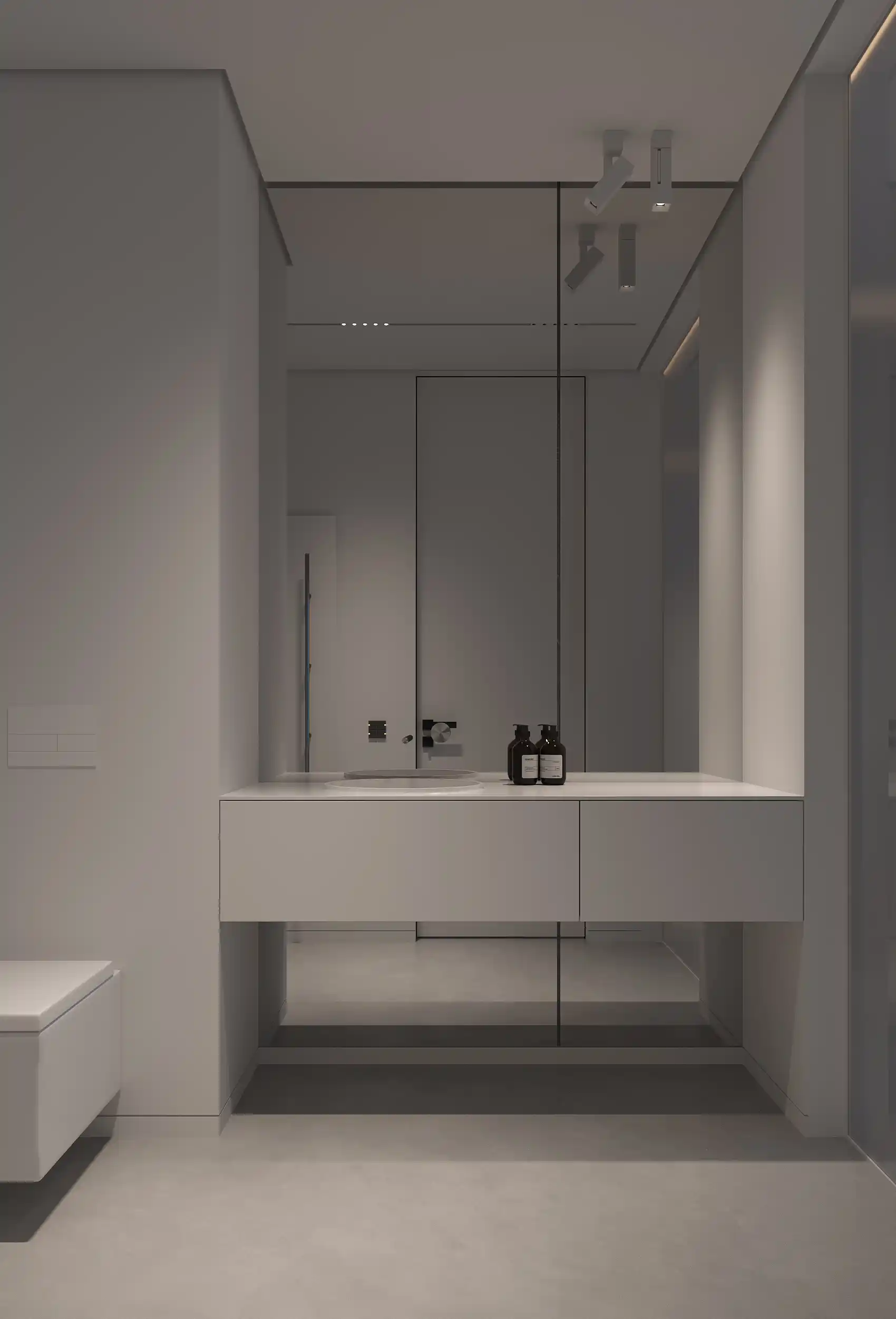 Bathroom has a modern minimalist design with neutral tones, mostly white and gray. It looks very clean and spacious thanks to clear lines and the absence of unnecessary details. There is a large mirror on the wall that reflects light and visually increases the space.