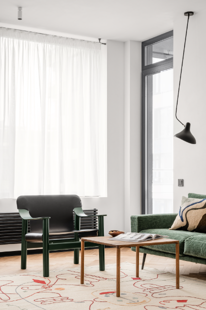 Situated in the vibrant Obolon district of Kyiv, this apartment offers a stylish and comfortable living space with breathtaking views of the Dnieper River. The interior is designed with a modern aesthetic, featuring open spaces, high ceilings, and large windows that allow natural light to pour in. The color palette is dominated by soft neutrals, creating a calm and inviting atmosphere. The apartment's location provides easy access to local amenities while offering a peaceful retreat from the busy city.
