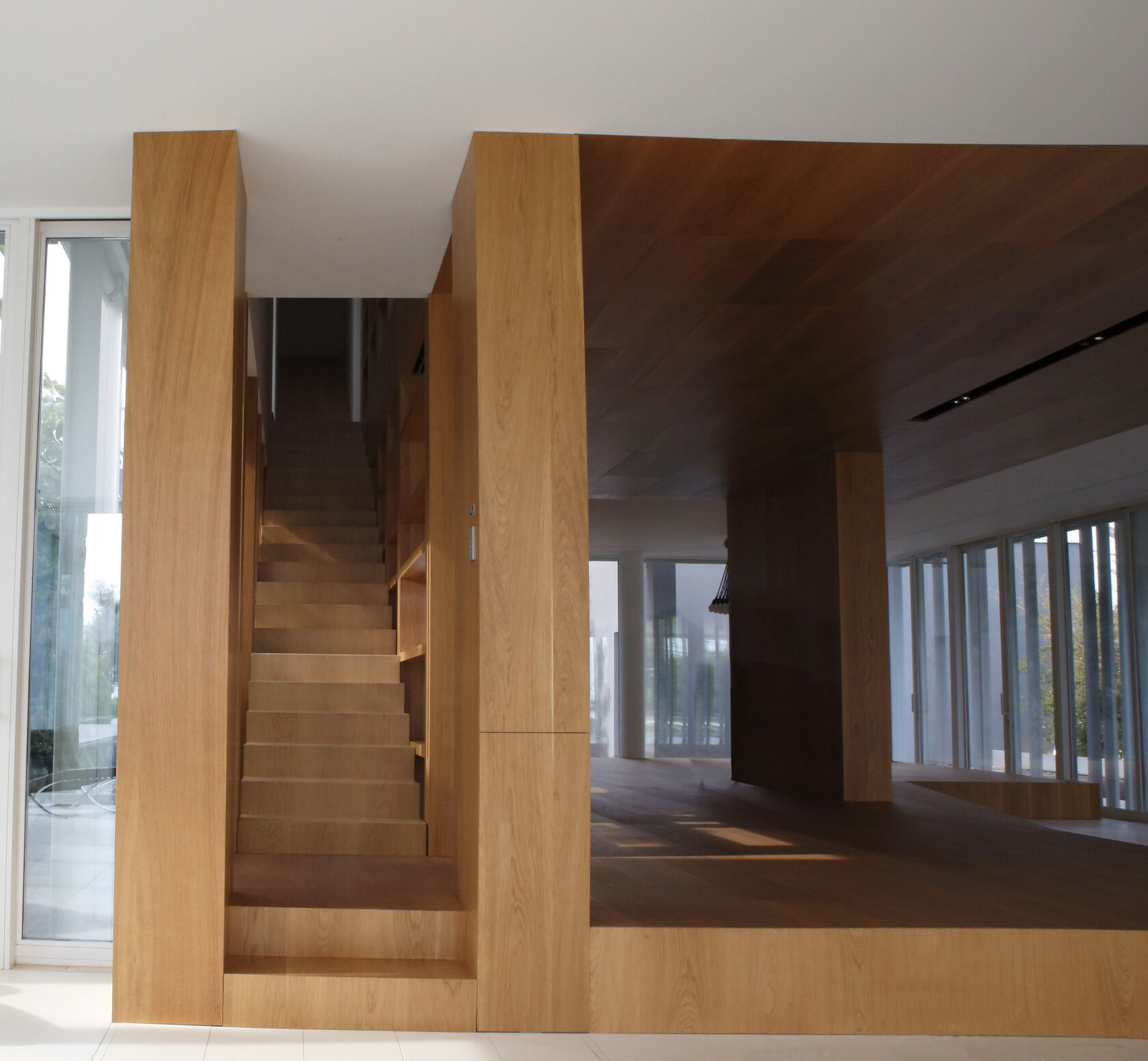 The image shows the interior of a modern house, made in the style of minimalism with elements of modern architecture. The space is characterized by clear lines, minimalist shapes and a predominance of light colors. The white color of the walls and furniture creates the effect of space and light, emphasizing the cleanliness and simplicity of the interior. The glass balustrade of the stairs adds transparency and lightness, while the use of dark marble on the stairs adds luxury and contrast.